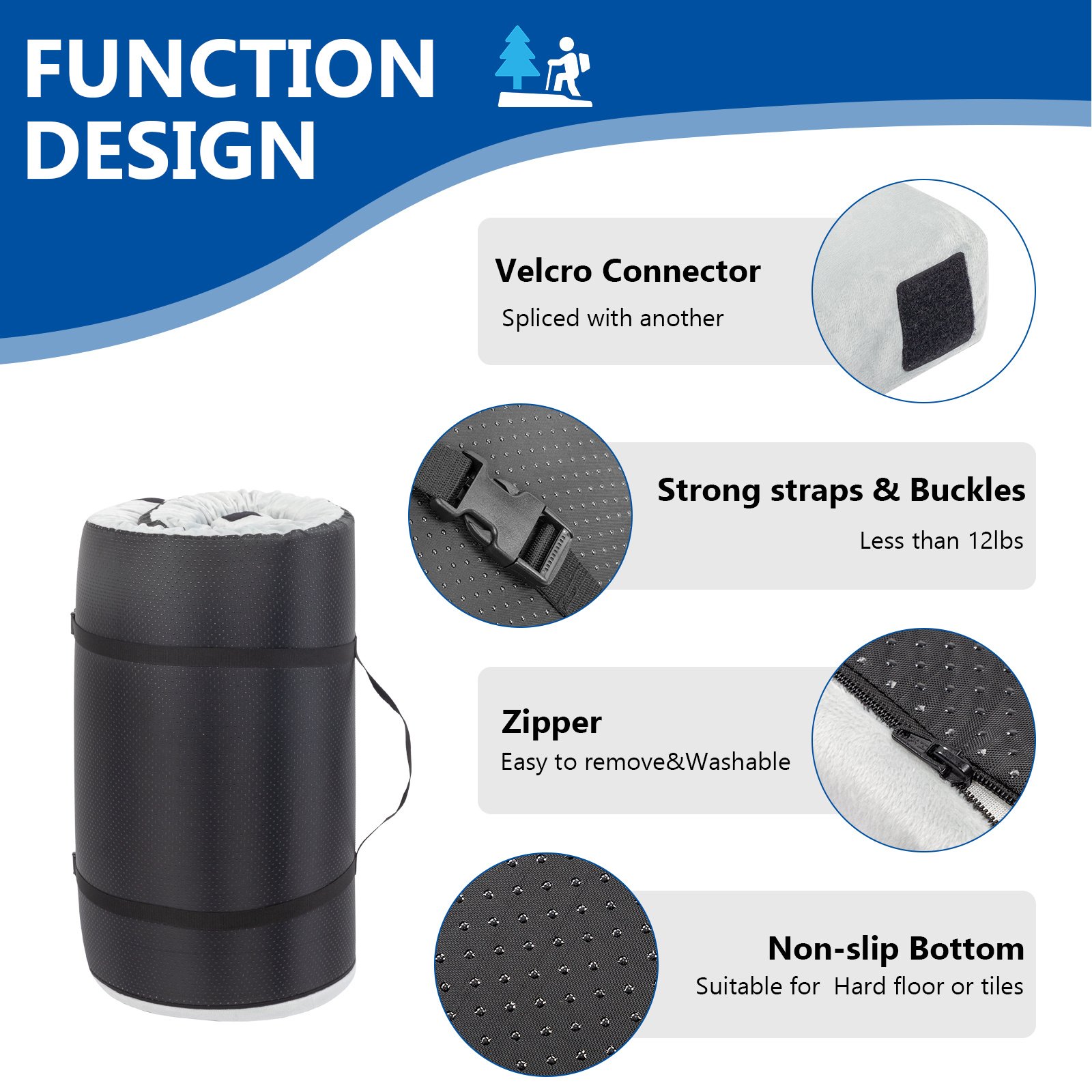 Introductions:Versatilemattress.Thesleepingmatisgreatfortravelingoracarbed,tentcamping,guestbed,floorbed,collegedorms,andfloormattressforadultstouse.Eightvelcroconnectorsinthecornerdesignmakeiteasytofastentofitmorepersons,youcancreateyourcustomsleepingpad.Thissleepingpadwillbeagoodchoiceifyouarelookingforacampingbed,floormattress,kidsplaymat,petcot,cotmattresspadorcarmattress.Features:Safematerial&Guaranteed:OursleepingpadforcampingiscertifiedbyCertiPUR-USandOEKO-TEXSTANDARD100.Safermaterial,healthierlife.Thememoryfoam,highdensitypolyfoam,andplushfabriccoverareallmadeofsafematerial.Theproductissuitableforpregnantwomenandinfants.Makeyouroutdooractivitiesmoreenvironmentallyfriendlyandhealthy.High-qualitystructure:Foamsleepingmatsforcampingisupto2.5inchesthick.Theclothcoverismadeofvelvetlikeplushfabric.Letyourelaxwholeheartedly.Thecampingmattressfeaturesa2-Layerdesignthatincludes1’’gel-infusedmemoryfoamand2’’high-densitysupportfoam.Thecombinationcreatesamedium-firmthatbalancescomfortandsupportandkeepsitsshapeevenafterlong-termuse.Sleepcomfortably:Thehighdensitypolyfoamactsasasupportivefoundationtopreventyoufromhittingthegroundwhenyoulieonthepad.Thememoryfoamconformstoyourbodyshape,responsestoyourbodyheatandpressure,offersyouenjoyablecomfortandprotectsyourback,spine,andhipswhensidesleep.NomorebackpainorannoyingDiscomfortfromrockyterrainfrominflatablesleepingpad.Easytocarry&Beversatile:Itisveryconvenienttoroll.Andwewillprovideyouwiththeappropriatetravelbag.Itcanberolledupandcarriedinabaginseconds.Perfectforindoorandanyoutdooractivities,inthelivingroomcanbeusedbyguests.Itisplacedontheindoorfloorwherechildrencanclimbandplay.Suitableforfamiliesoutonatripcamping.Youcanalsocarryittoparticipateinoutdoorhikingsports.Thebottomisdesignedtobewaterproofandnon-slip.Easytoclean:Thisportablebedcomeswithonestrap,whichareeasytorollupintoacompactsizeandcarry.Thehigh-qualityzipperissmoothanddurable,whichcanbeeasiertoremovethezipperedcoverinseconds.Machinewashablecover,simplyzipitoff,andpopitinthewasheranddryer.Thewhiteliningprotectsthedensefoambetterandextendsitslife.Comeswithatravelbagisconvenientforeasystorageandtravel.Tips:Theinstructionsays"fullrecoverymaytakeupto48hours",somemattressmayreboundslowlyiftheyremainvacuumpackedformorethan1month.Theexpansionthicknessandtimewillbeaffectedwiththechangeoftemperature.Ifthereareanyproblemsduringyouruse,feelfreetocontactusatanytime,wewillfindthebestsolutionforeverycustomer.Specificatios:1.Material:MemoryFoam2.ProductDimensions: 75"Dx25"Wx2.5"H3.Color:Gray4.ItemWeight:6.8lbs/3.1kgPackageIncludes:1xmemoryfoamcampingmattress1xcarrybag1 x strap