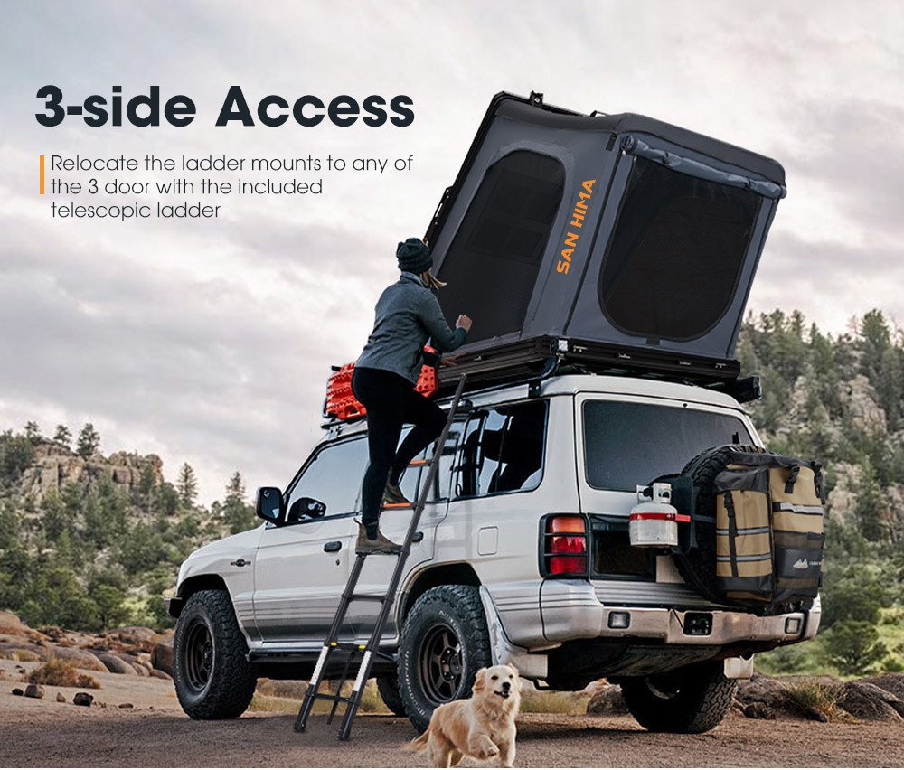 Safe and Sturdy: Our telescopic ladder extends to 2.3m with a 150kg load capacity, and can be hooked at three sides for added flexibility.*NOTE: Always thoroughly dry your rooftop tent after each use, avoid storing it in a damp environment, and ventilate regularly if unused for long periods.